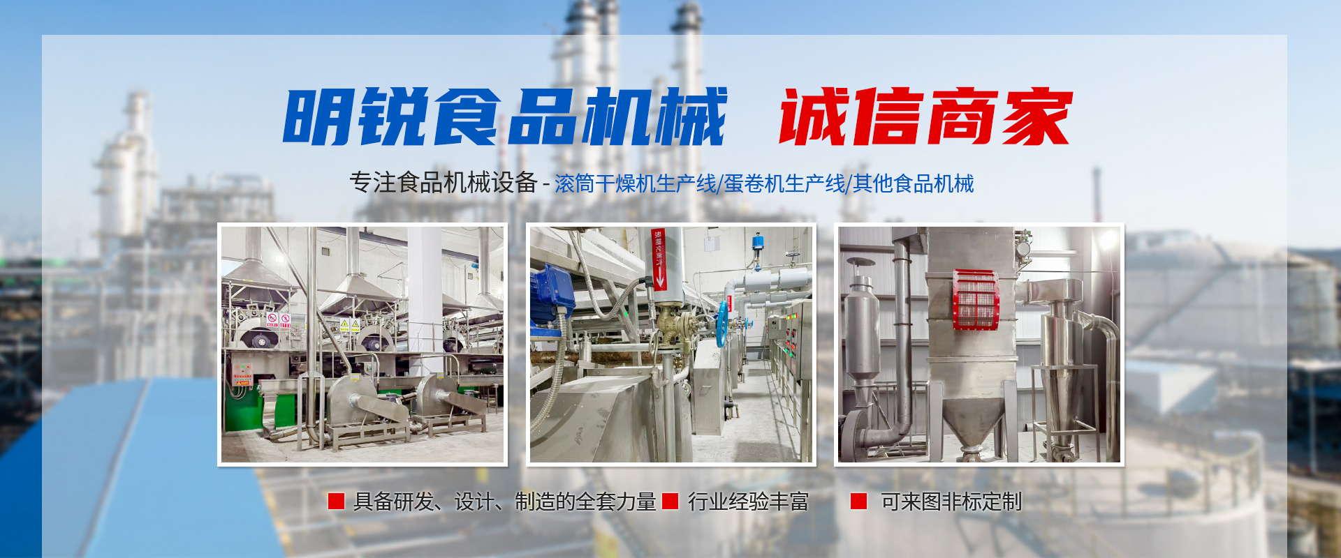 東臺市明銳食品機械有限公司是一個從事食品機械設(shè)備設(shè)計、制造和安裝調(diào)試的專業(yè)廠家,在食品生產(chǎn)工藝、生產(chǎn)流程及設(shè)備設(shè)計和制造有著多年豐富經(jīng)驗。主要產(chǎn)品有蛋卷機生產(chǎn)系列,滾筒干燥機生產(chǎn)線系列以及其他食品機械。目前各種生產(chǎn)線規(guī)格齊全,國內(nèi)技術(shù)優(yōu)良,產(chǎn)品遠銷亞洲各國及國內(nèi)二十多個省市自治區(qū)。